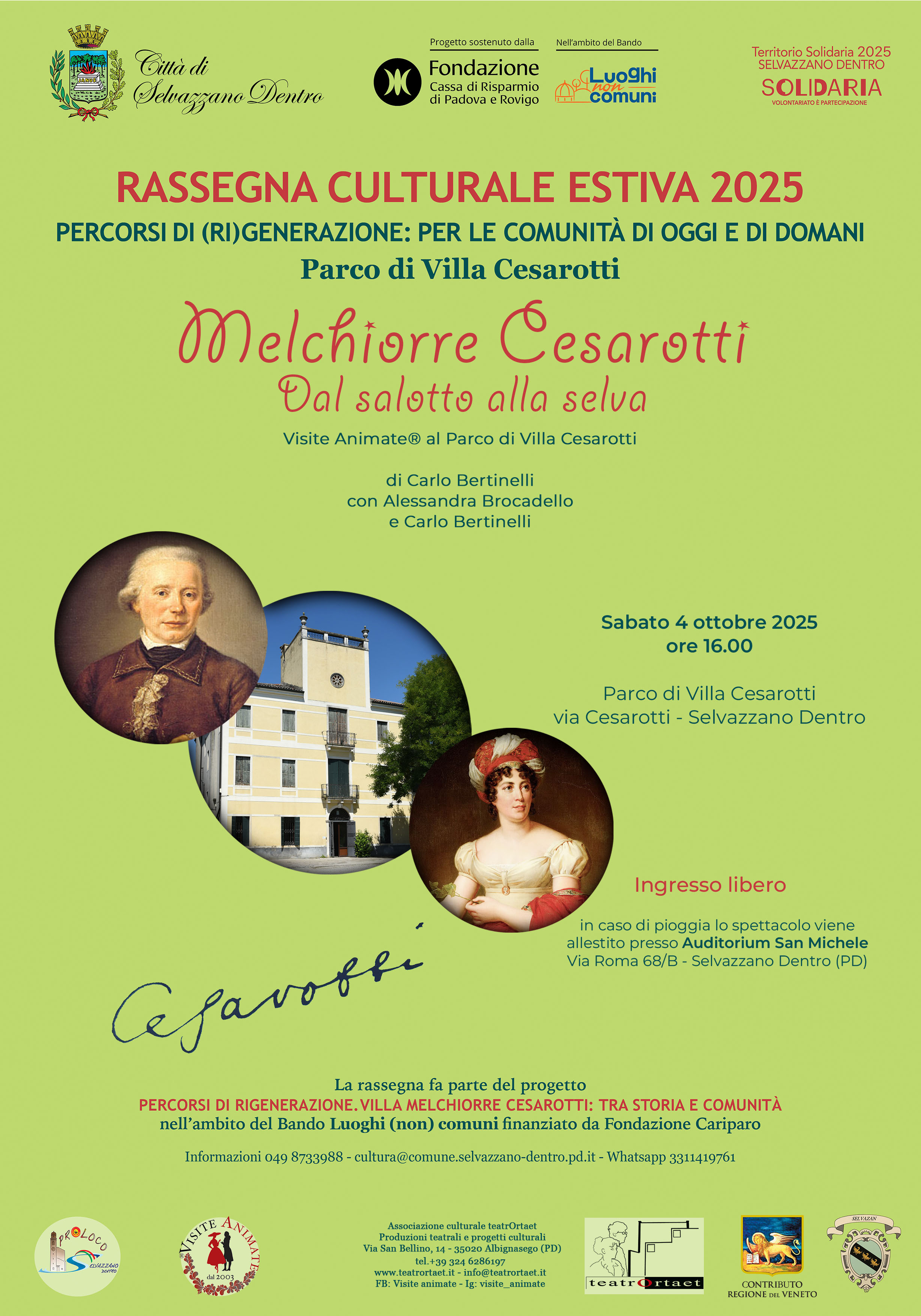 Per rendere questa figura, la visita animata® nel parco di villa Cesarotti a Selvazzano, ripercorre i luoghi più emblematici (solo in parte giunti fino a noi) del parco della villa, che Cesarotti trasformò in un consolante rifugio degli ultimi anni: il Selvagiano. Lo spirito del suo Selvagiano, dio bifronte rivolto al passato e al futuro, guarda alle trasformazioni della sua amata dimora e al ruolo che eserciterà l’insegnamento di Melchiorre Cesarotti, in un ideale percorso dal salotto alla selva, dove incontra la padovana Francesca Bragnis Capodilista, con la quale ripercorre i primi decenni della propria vita, la veneziana Giustina Renier Michiel, autrice delle prime traduzioni italiane di Shakespeare, Madame de Staël, figlia del ministro francese Necker, repubblicana antinapoleonica e l'ultima compagna, Laura Botton.