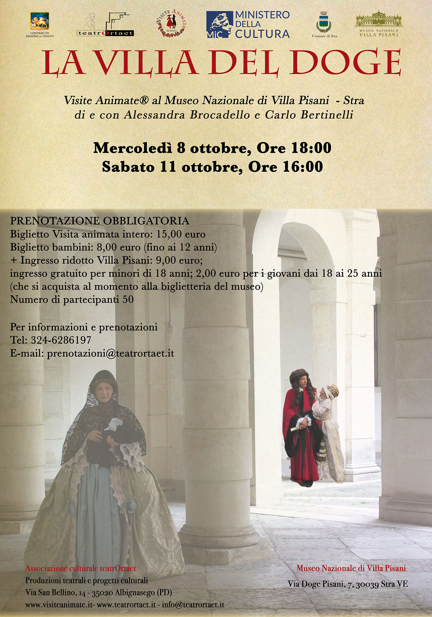 La visita animata® si rappresenta all’aperto, tra il magnifico parco e i grandi cortili della villa e ripercorre la storia di Villa Pisani, soffermandosi sulla storia della Serenissima dai primi decenni del Settecento, quando l’antica residenza di Stra, sulla Riviera del Brenta, appartenente ai Pisani di Santo Stefano venne completamente trasformata in un complesso monumentale inserito in un parco di 14 ettari.