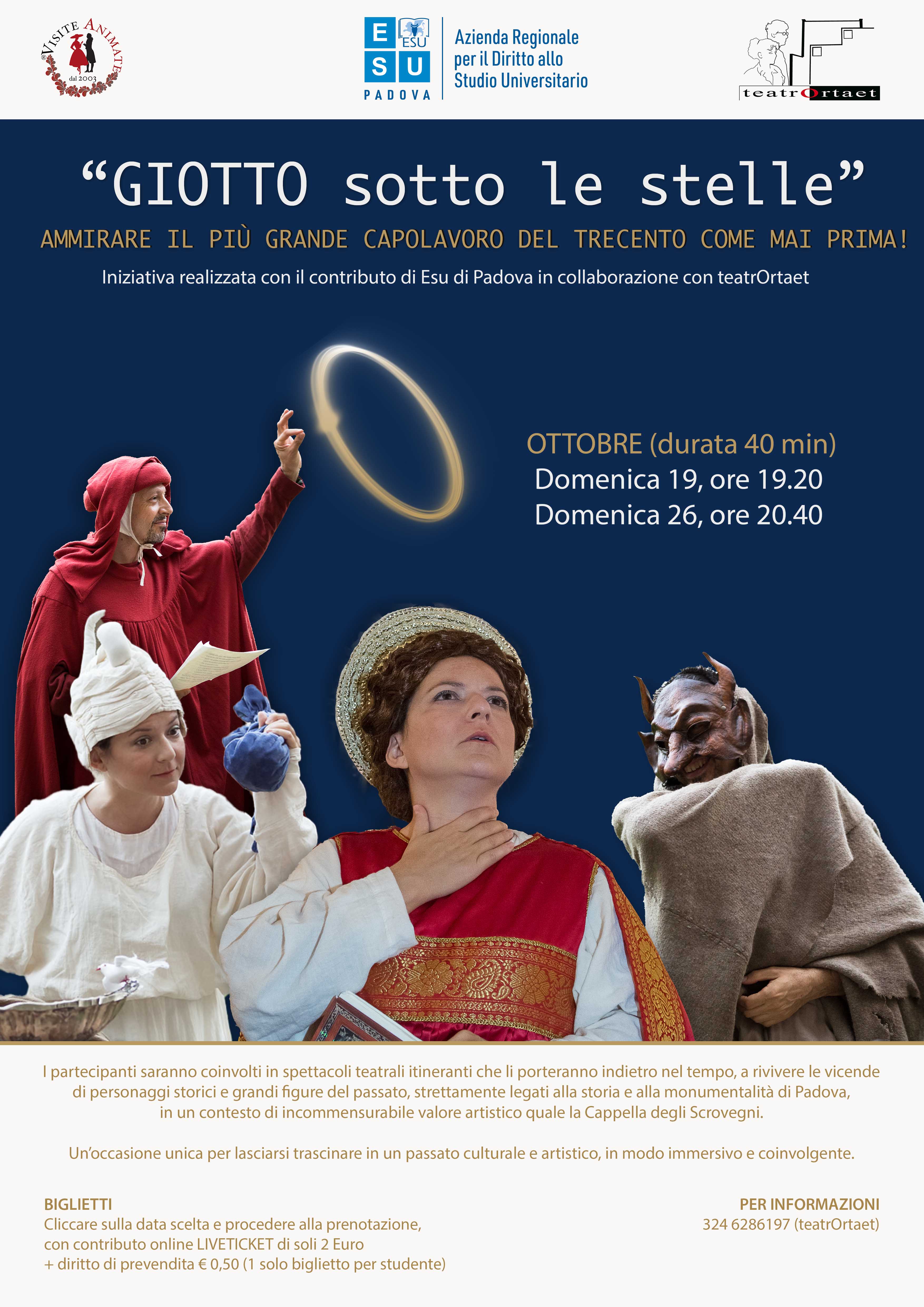 Nella Visita animata® alla Cappella degli Scrovegni di Padova, GIOTTO SOTTO LE STELLE, i personaggi evocati dagli attori di teatrOrtaet, Alessandra Brocadello e Carlo Bertinelli, accompagnano i visitatori in un itinerario che parte dal C.T.A. (corpo tecnologico attrezzato), continua nella straordinaria atmosfera della cappella, in cui il tempo scorre sempre troppo rapido per saziare gli occhi con i particolari del racconto della Salvezza e finisce nel chiostro degli Eremitani. Le parole racchiudono la contemplazione del ciclo giottesco in una cornice emozionale, ma adeguatamente documentaria, che si articola intorno a tre grandi contrapposizioni: fama-infamia; salvezza-dannazione; ricchezza-povertà.