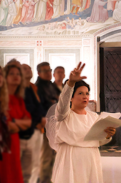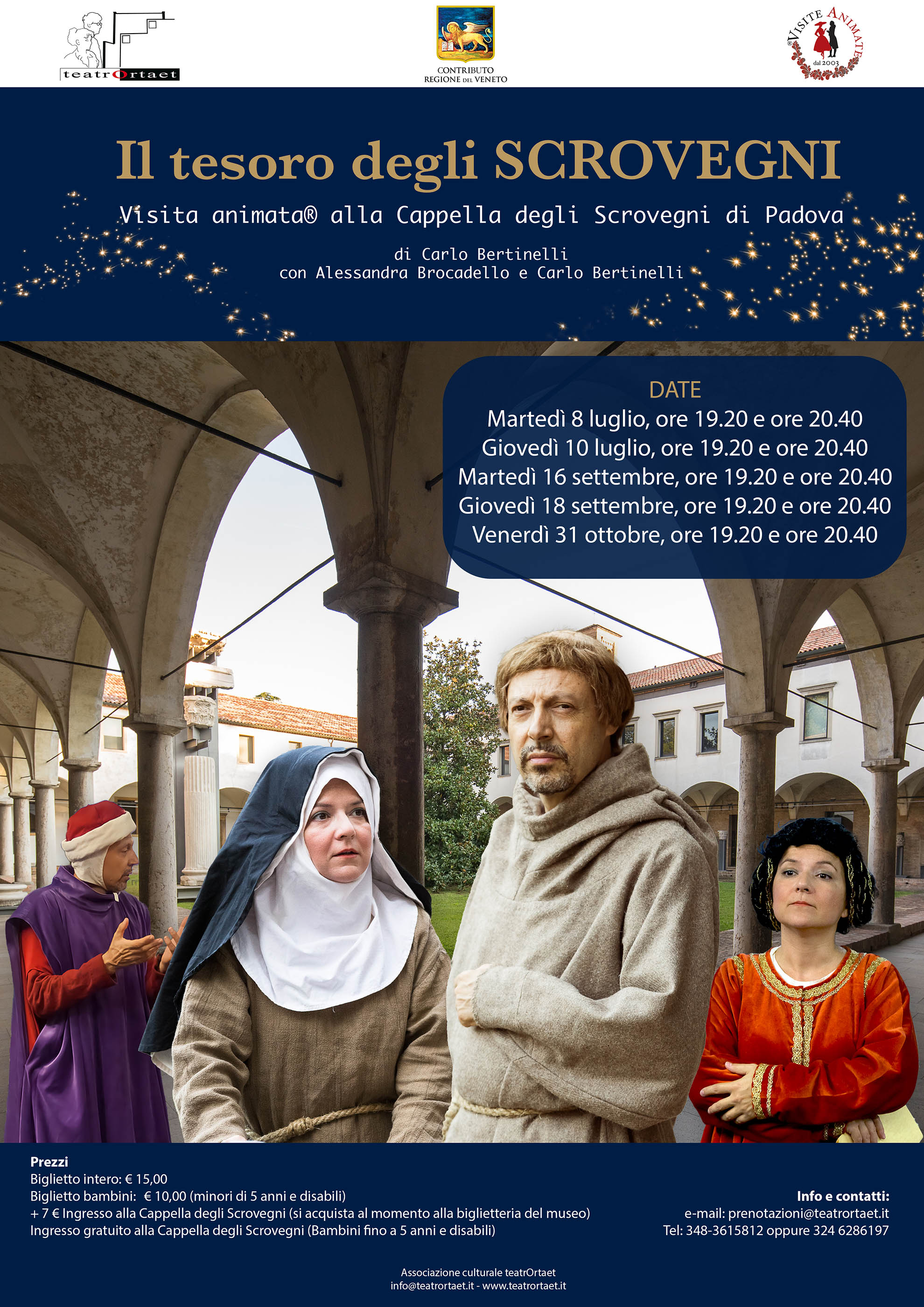 Nella nuova Visita animata® alla Cappella degli Scrovegni di Padova, IL TESORO DEGLI SCROVEGNI, i personaggi evocati dagli attori di teatrOrtaet, Alessandra Brocadello e Carlo Bertinelli, accompagnano i visitatori in un itinerario che parte dal C.T.A. (corpo tecnologico attrezzato), continua nella straordinaria atmosfera della cappella, in cui il tempo scorre sempre troppo rapido per saziare gli occhi con i particolari del racconto della Salvezza e finisce nel chiostro degli Eremitani. La prima parte dello spettacolo si svolge nel C.T.A. della cappella, mentre la parte centrale della visita si svolge all’interno della cappella, dove il significato del ciclo pittorico viene illustrato da Alberto da Padova, il teologo agostiniano che (secondo il prof. Giuliano Pisani), avrebbe ispirato il soggetto degli affreschi e sarebbe raffigurato al centro del “Giudizio Universale” mentre offre la Cappella alla Vergine. Lo affianca la Carità, protagonista del Giubileo 2025. La visita termina nel chiostro con le ambizioni di Enrico Scrovegni e della seconda moglie, Jacopina d’Este, che in un dialogo tra di loro confidano agli spettatori i retroscena degli affreschi di Giotto. Nuovo titolo per la versione estiva (della durata di 60 minuti)
