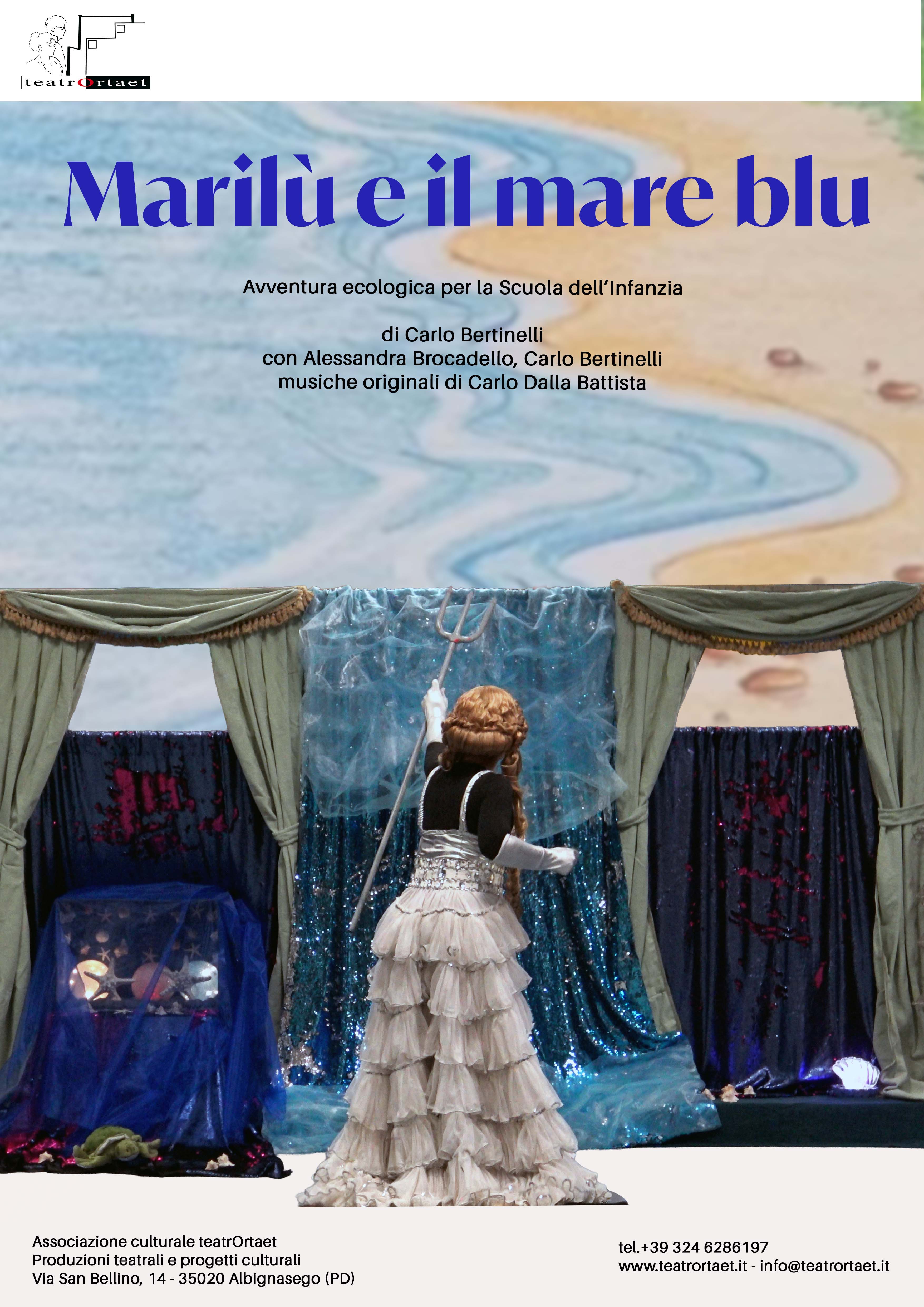 “Marilù e il mare blu” è uno spettacolo di teatro d’attore e di figura, con musiche e canzoni originali cantate dal vivo, rivolto ai bambini della scuola dell’infanzia, che ha come tema principale la salvaguardia del mare e dell’ecosistema, la conservazione marina e la responsabilità ambientale. Un’avventura ecologica che utilizza un dialogo vivace tra i mondi terrestre e marino per mostrare come le azioni in un ambiente influenzino l'altro.