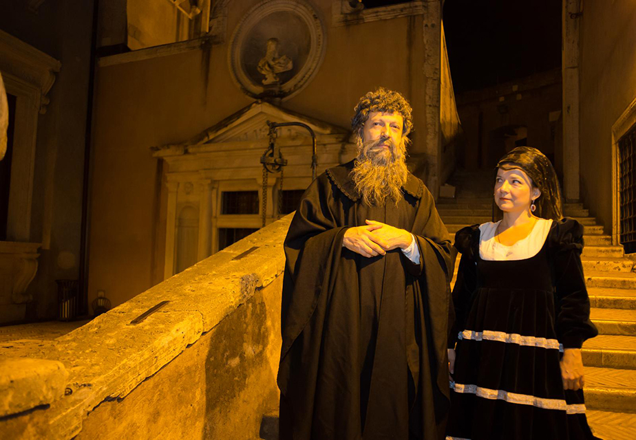 "Castel Sant'Angelo allo specchio. I volti segreti della storia" ha assunto l'aspetto di un'autentica carrellata di personaggi storici, che mette alla prova le doti trasformistiche del duo di teatrOrtaet chiamato a calarsi, in rapida successione nei panni dei grandi protagonisti politici, religiosi e artistici del Cinquecento romano. Un momento in cui su Roma si concentra l'attenzione dell'Europa intera. Tutta la prima parte della visita infatti è incentrata sull'evento di cui quest'anno ricorre il cinquecentenario: l'inizio simbolico della "protesta" luterana con l'affissione delle 95 tesi.